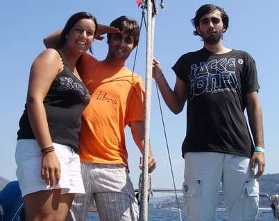Aquí en esta foto se puede ver a los dos marineros y al futuro capitán: Almudena, Moisés y Fran (Fran está terminando la carrera de Marina Mercante), me acompañaron hasta el puerto deportivo de Vigo, que será donde previsiblemente pase el invierno: