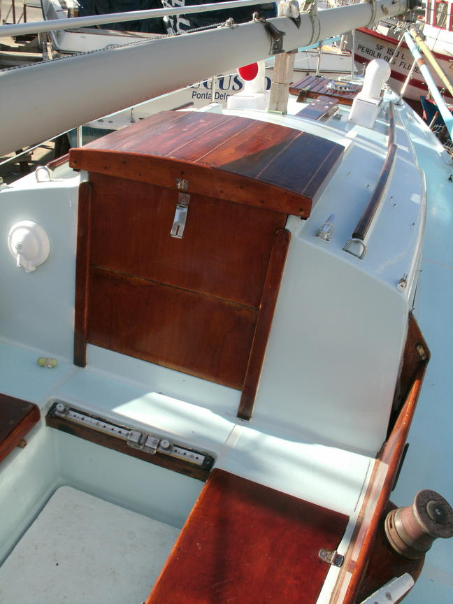 Y aquí ya tengo el tambucho recompuesto y reforzado, en la foto quizás no se note, pero por debajo lo reforcé con unos listones de aluminio anodizado, y en las esquinas de popa con unas escuadras de latón: