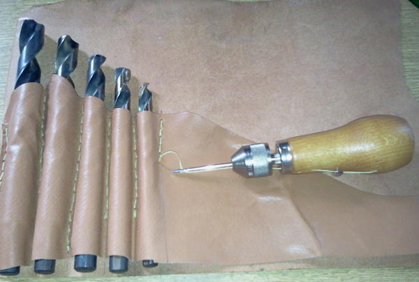 En estas fotos me estaba haciendo un estuche de cuero para las brocas del taladro, antes las tenía en una caja de plástico, pero de esta otra manera se ahorra mucho espacio, se encuentran más rápido y además no hacen ruido cuando se mueve el barco: